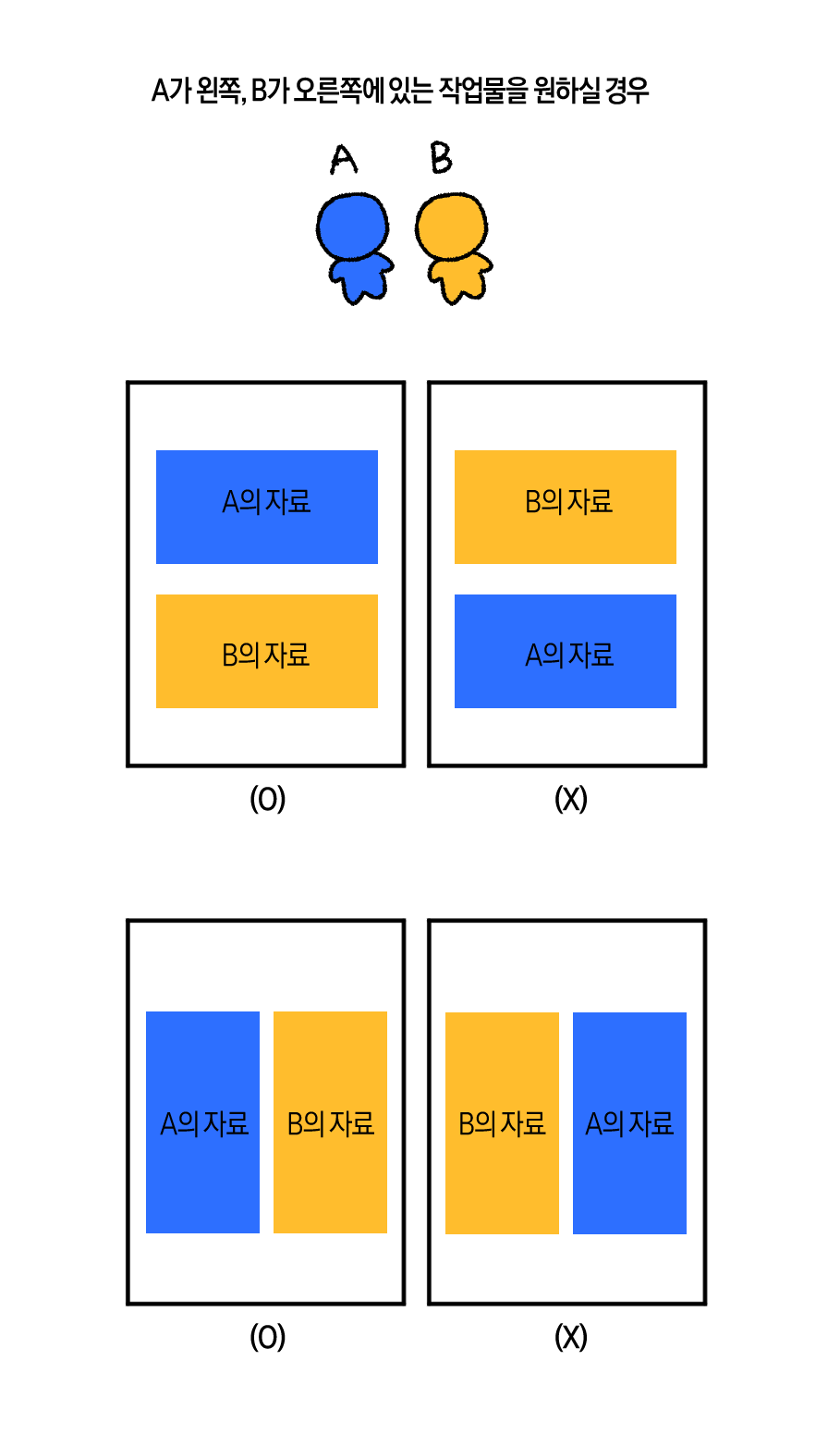 - 캐릭터의 위치 지정이 있을 때 자료는 꼭 위에서 아래, 왼쪽에서 오른쪽과 같은 순서로 정리 부탁드립니다. (ex. 왼쪽에 A캐릭터, 오른쪽에 B캐릭터를 희망하실 때, B캐릭터가 왼쪽 혹은 위에 첨부되어있는 등의 자료는 혼선이 옵니다.)